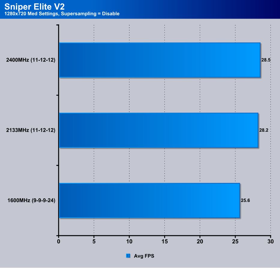 Sniper Elite V2 is a newer game we just recently added to our testing, so we went ahead and threw it in here just to see if it added any performance in real world gameplay. As you see here switching to XMP does make a difference and the FPS gain is pretty decent at almost 3FPS. moving a little further with frequency you can see that the gain is not large and that is because the botttleneck is no longer on the memory and more on other components, but there is still a gain which tells our that you can see benefits especially as programs become more memory intensive.