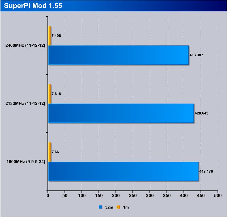 Here we have SuperPi which does very well for testing efficiencies and also stability of a platform. The 1M test is the short and dirty test with very minor gains from tweaking memory. However in the long 32M test you can see that the small tweaks in memory can make a pretty big difference in things like render jobs where data will be consistently processed for a long period, it can save you quite a large amount of time depending on the job possibly even minutes which if it is a production system that can save huge money as well by getting work done faster.