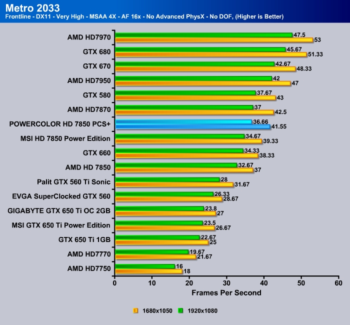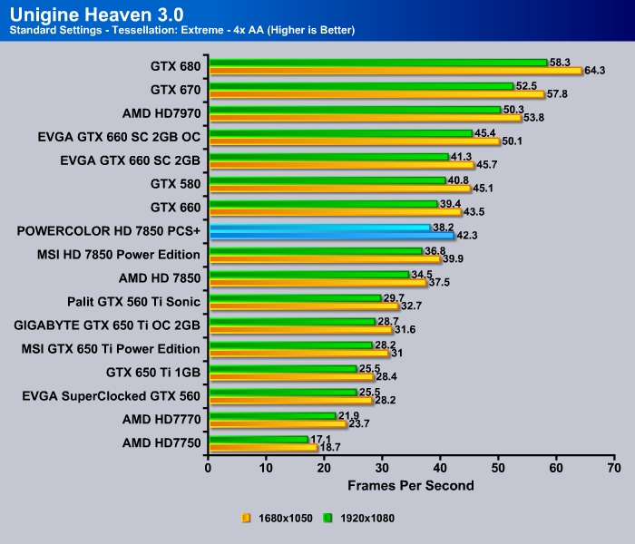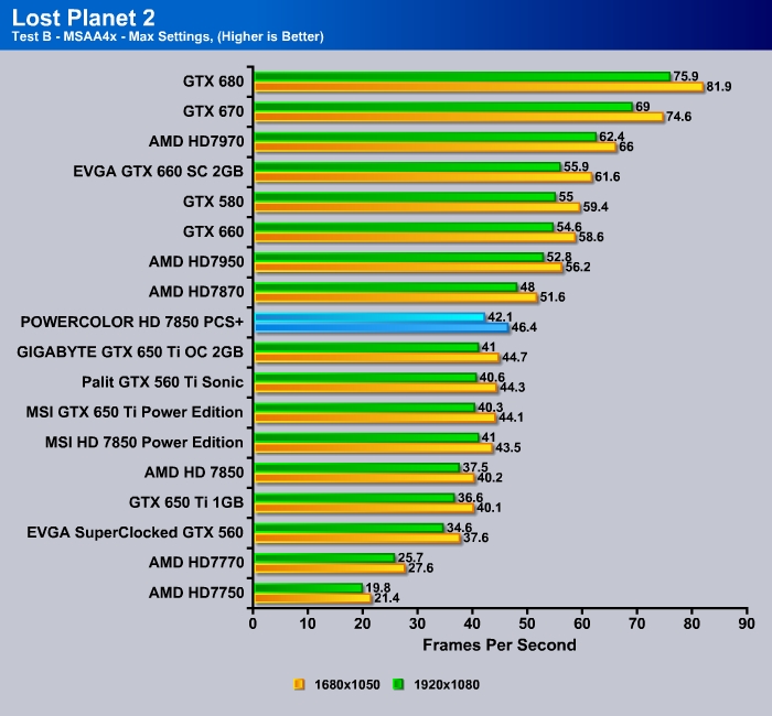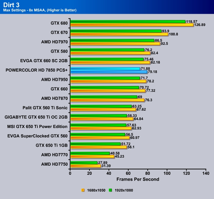 As expected, the PowerColor HD 7850 PCS+ offers on average about 10~15% faster than the reference HD 7850. When games are not shader bound, the card can even performs just like HD 7870 due to its overclocking speed. The extra overclocking also helped the card to perform much closer to the similarly priced GeForce 660.