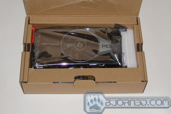 Typical fashion with the HD 7850 PCS+ box where we get plenty of marketing information highlights the various features of the card such as its custom cooler, 2GB of onboard memory, and the Eyefinity support.