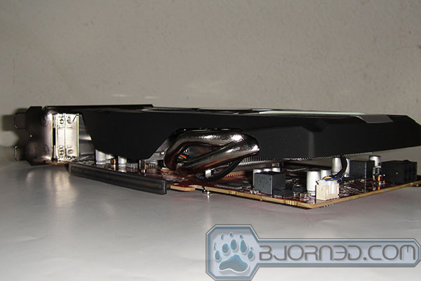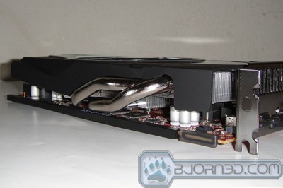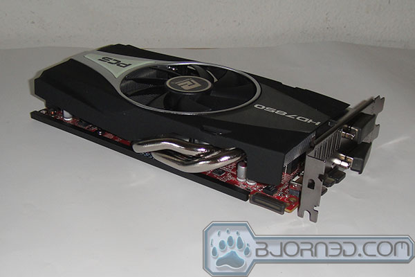 The PCS cooler that PowerColor puts on the HD 7850 features a single 92mm fan placed above the GPU core. Underneath the fan is a large heatsink with two pieces of S shaped heatpipe extending out of the heatsink. The two curved heatpipes direct the heat away from the heatsink from the GPU to the cooling fins. One minor issue we found with the SS shape heatpipe design is the slight protrusion above the top of the card. The tallest portion of the heatpipe extends about 0.7 inches above the card that potentially can have some issue with cases that feature a side panel fan. Other than that, the cooler looks great and the large 92mm fan should be able to keep the card running cool while keeping the noise-level down.