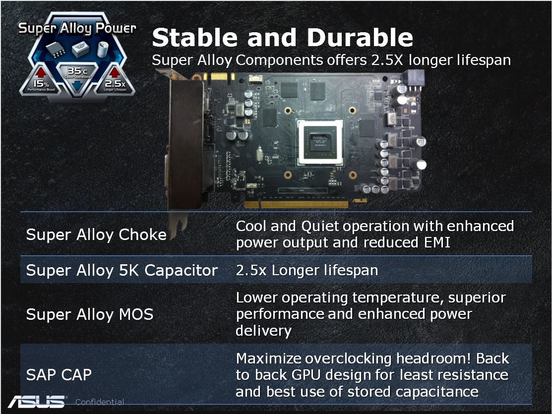 ASUS has great pride in the components they infuse into their graphics offerings, very much like the motherboards we have covered previously. ASUS has what’s called a SAP or Super Alloy Power, which covers the components in the very VRM we are discussing. The components are hand picked for quality and performance based around not only power delivery but efficiency as well. The components in the SAP solution are super durable for a rated lifespan of up to 2.5x what reference cards would offer.