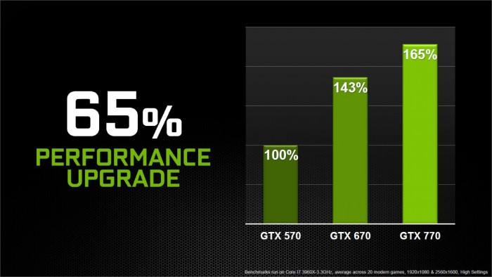 As I have already stated the GTX 770 can easily sweep away the 680 and as you can see from these notes supplied by Nvidia the GTX 770 is up to 65% faster than the GTX 570 and 22% average faster than the outgoing 670 card. This is something to notice as this is not just a GTX 680 GPU but also built upon a respectable PCB and even some insane memory capability combine to make for a very favorable enthusiasts level card.
