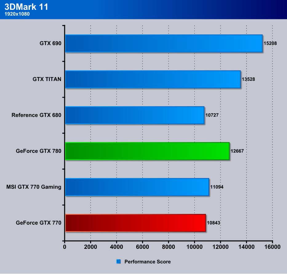 Here you can see in 3DMark 11 the GTX 770 pulls a nice little lead over the 680, slotting it a bit behind the GTX 780.