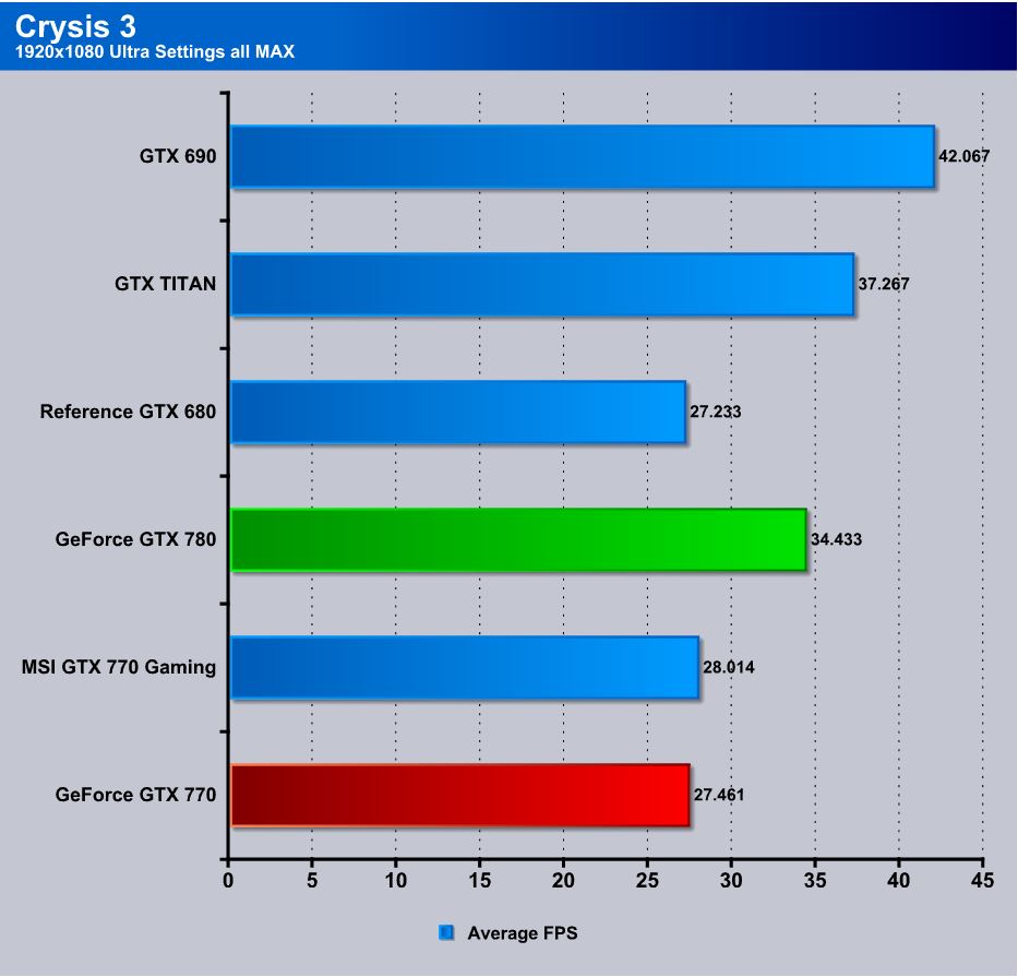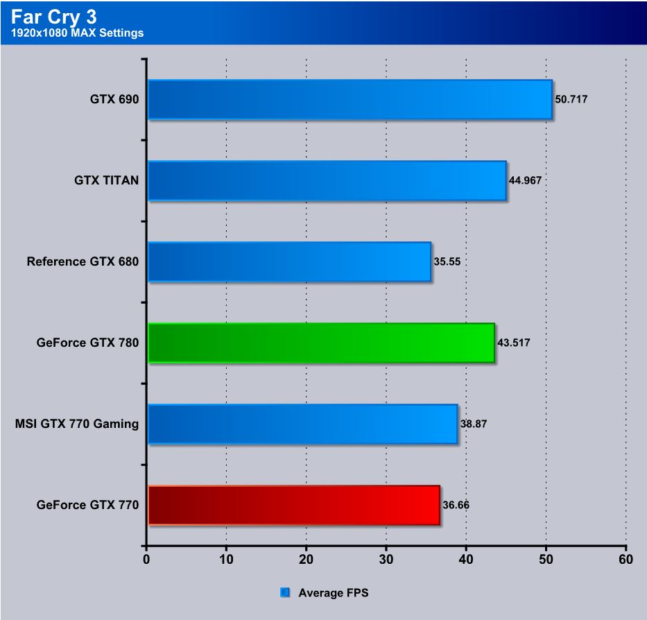 Moving over to Far Cry 3, we used a pre determined path and re-ran each card to monitor average FPS across the complete run. Each run was completed multiple times to ensure continuity and accuracy. Here the 770 ekes out a single FPS more than the previous gen 680.