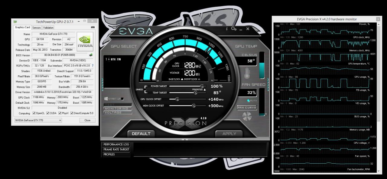 The 770 turned out to be one hell of an overclocker, taking the GPU from 1085 Boost clock to 1280 Boost clock. This was just shy of 1300MHz GPU, a speed we achieved simply by setting the thermal target to 85C. There were no voltage adjustments, as we try to keep our overclocking protocols simple and similar to what most users can do at home.