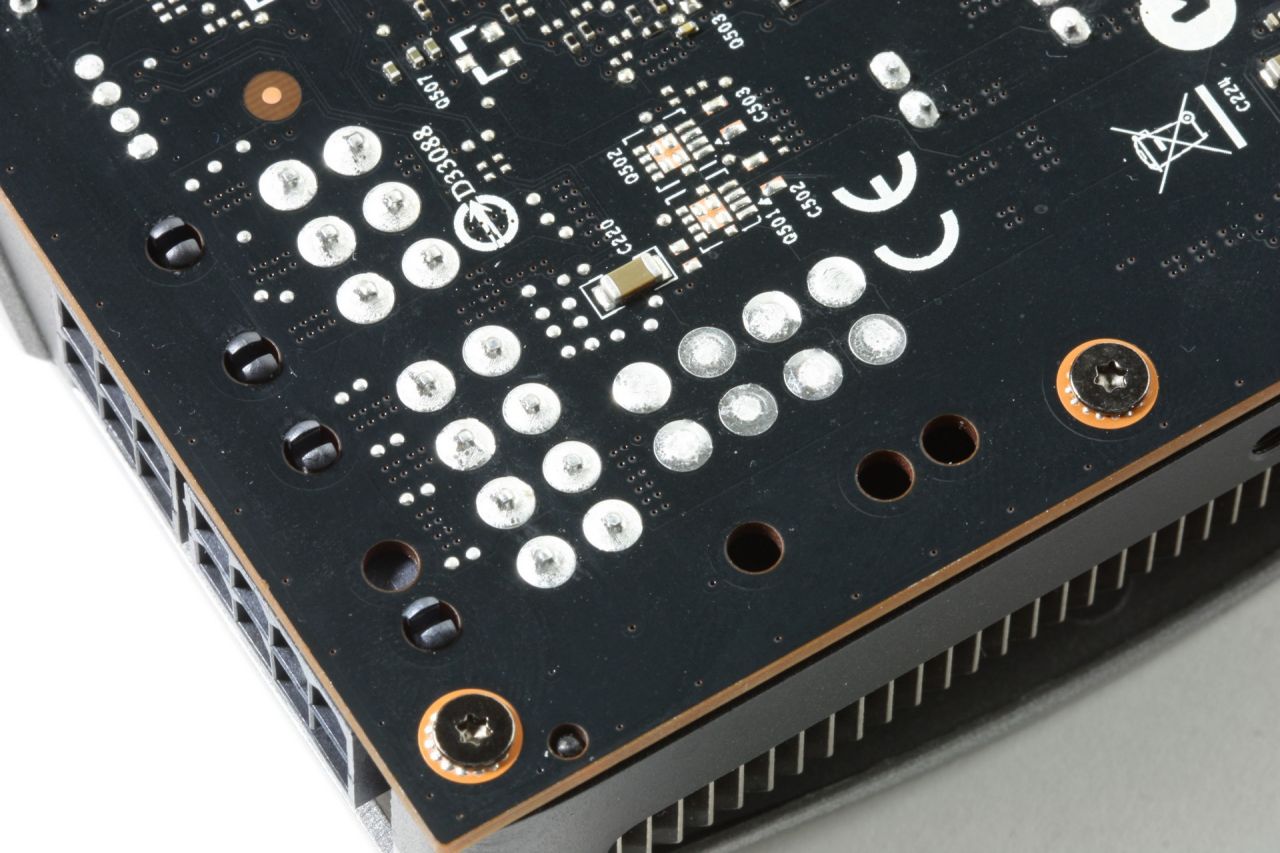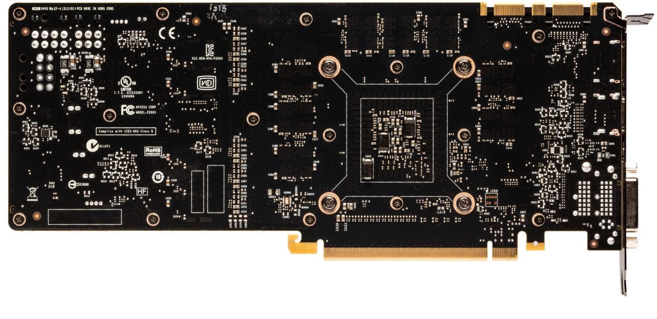 Like the GTX 780, the GTX 770 shows an absence of memory IC’s on the rear of the PCB. This card only has 2GB of framebuffer so there will be a couple empty pads in the front as well, but either way, 2GB should be enough in most situations.