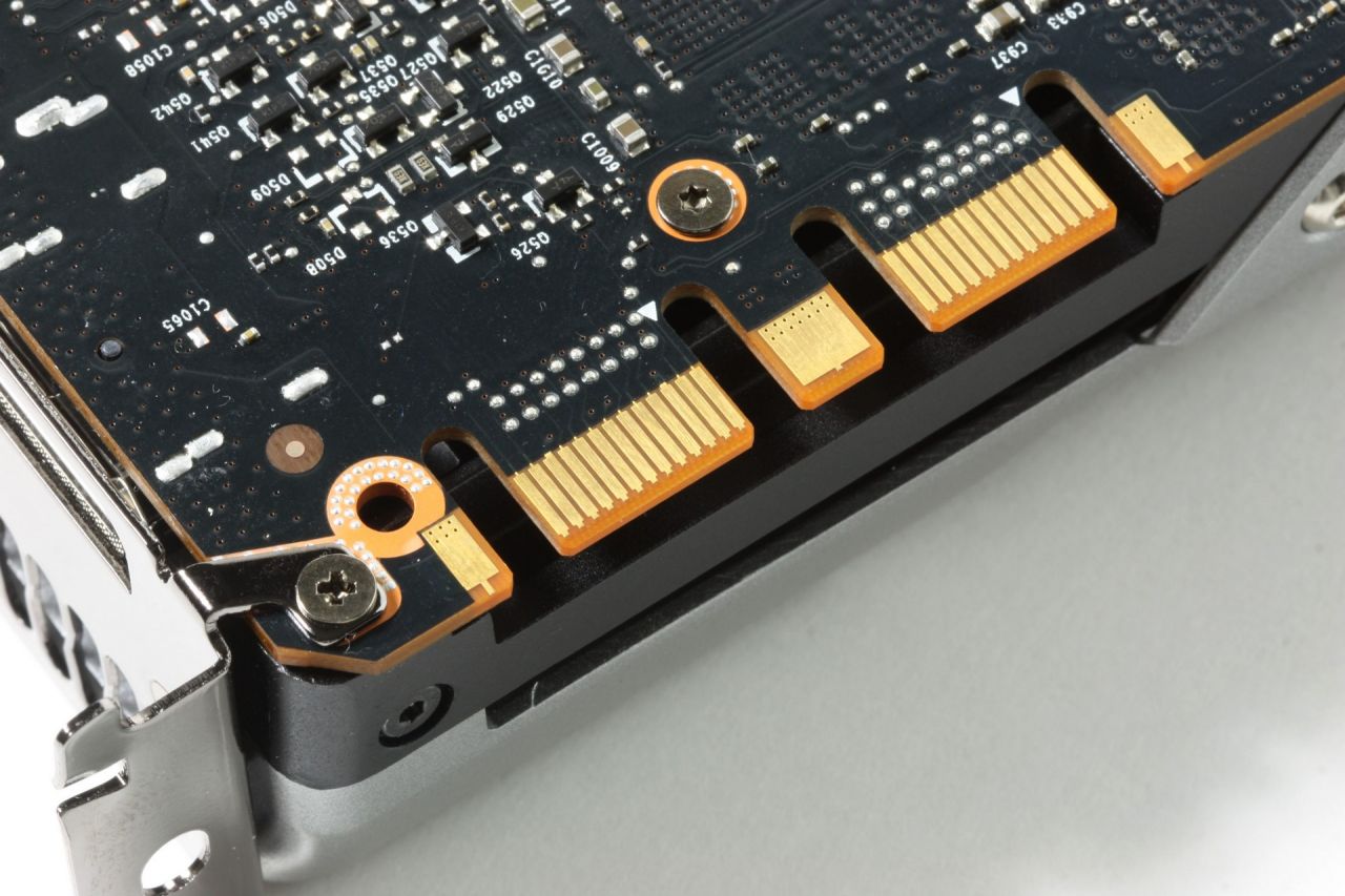 The top of the card houses the all too familiar dual SLI bridge connectors which allow for full 3-Way or even 4-Way SLI functionality. These would permit a system to scale well beyond a single GPU’s performance potential, should a game require it (Crysis 3 and Metro: Last Light come to mind here).