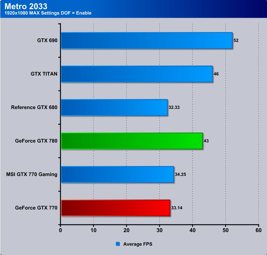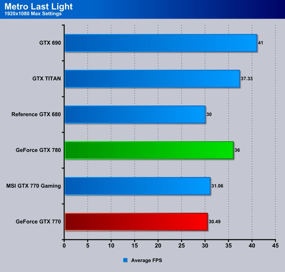 Here we have Metro Last Light which is a brand new game added to our testing platform as it just came out. If you thought Metro 2033 was stressful, you have seen nothing yet. The particles and lighting, as well as the PhysX effects all add up to an amazing looking game that can put a stun even the most powerful system in its tracks. Here the GTX 770 averages just above 30 FPS which is mostly enough for smooth gameplay. However, we would still prefer better performance with slightly lower graphics versus worse performance with the game maxed out.