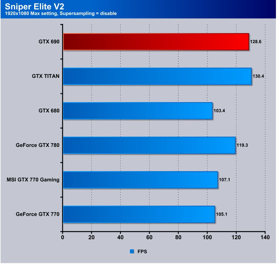Sniper Elite V2 is a fun game which, when first released, was quite stressful but still playable on most higher end cards. By now, most cards have surpassed it, and all of the cards we are testing here today break the 100 FPS mark. The 770 pulls again a few FPS lead over the 680 and is well playable even at maximum settings.