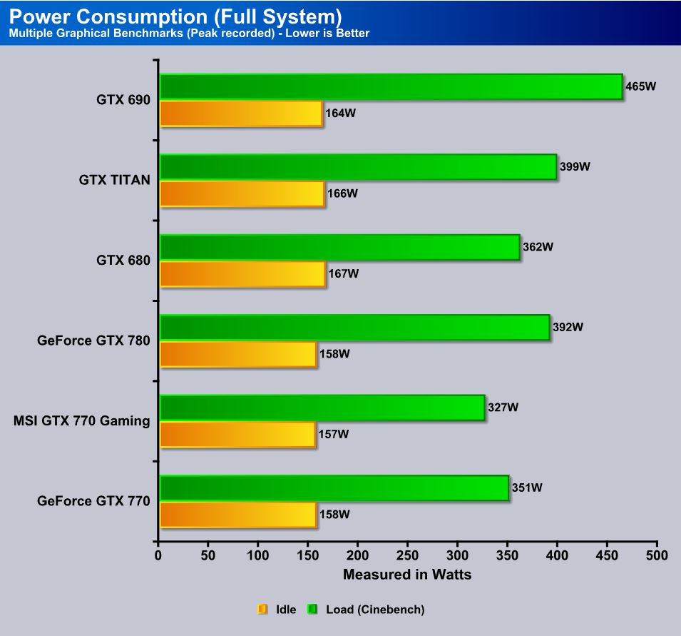 Here you can see that the GTX 770 idles at about the same power as the 780 and even loads up a bit below, likely due to the less powerful GK104 GPU. It does shave about 10 watts off of the previous gen 680, which was a bit of a surprise.