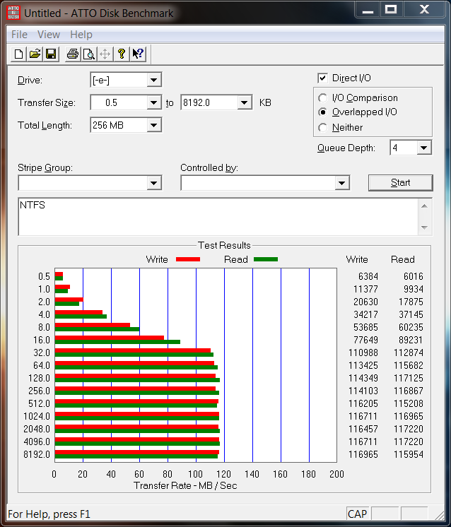 Additionally, NTFS is also much faster when comes to read and write. We can see that the drive tops off at 44MB/s read and write when it is format to FAT32. With NTFS, it almost tripled the transfer rate to 116 MB/s. The result we get here pretty much what we would expect from a 2.5” mechanical drive.