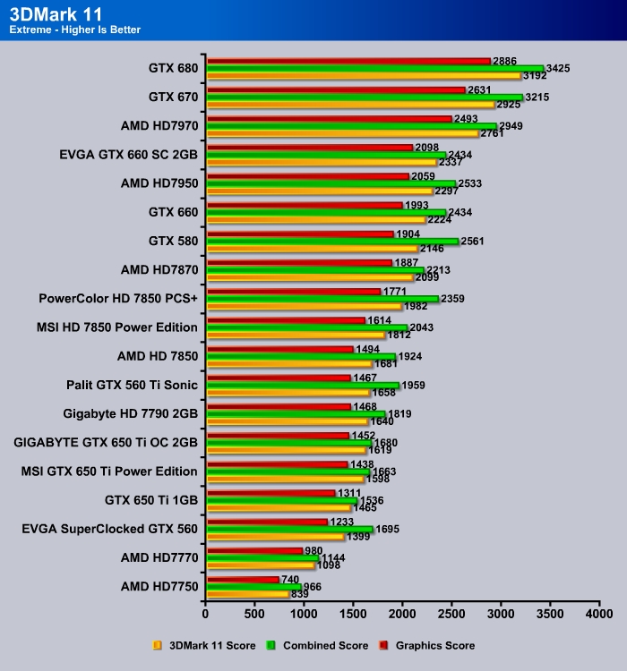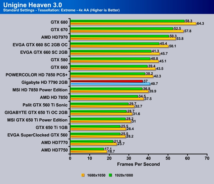 The Gigabyte HD 7790 scored 6052 points in the 3DMark 11 benchmark score, coming just a tad under the HD 7850 and is faster than the GTX 650 Ti.