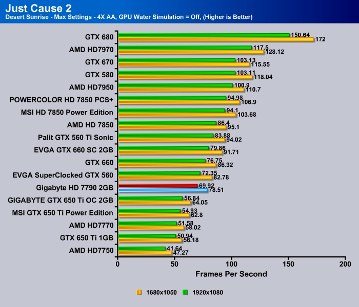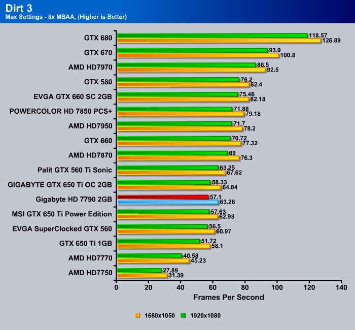 Again, with the HD 7790 and the GTX 650 Ti are essentially tie in Dirt 3.