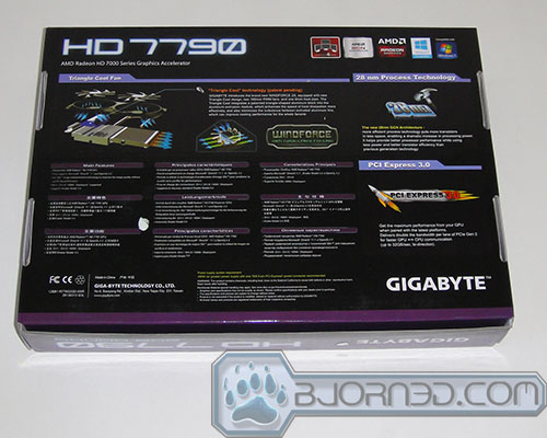 The Gigabyte HD 7790 arrived in a black and purple cardboard box. On the front, we can see it highlights some features of the card such as OC to 1075MHz and the WINDFORCE cooler. More information about the card’s Triangle Cool Fan can be found on the rear of the box.