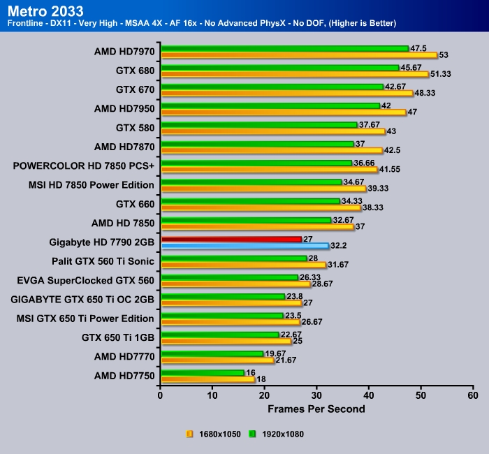 One of the more demanding game ever, the Metro 2033 shows the card is able to edge out the GTX 560 Ti. Despite the 75MHz overclocking, the HD 7790 is still not going to be able to out-performs the HD 7850. The more powerful HD 7850 is about 15% faster than the HD 7790 here.