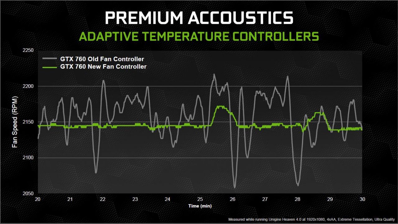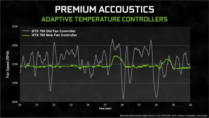 Here you can see how the new fan control implementation–Nvidia is setting this up to be a real quiet ultra gaming card. The ability to avoid the constant ramping of the fan drastically lowers the noise level of the fan, is which is what this is all about. Nvidia wants these cards to be able to play in any system, even in a bedroom with the bare minimum of noise while still offering class leading performance.