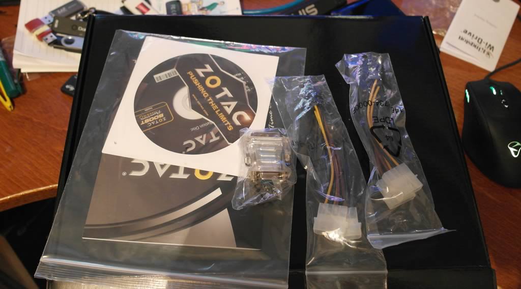 While Zotac includes games with their GTX Titan, GTX 780 and GTX 770 they have decided not to include anything with the GTX760. That is a bit of a disappointment but should keep the price down. What we get is a few adapters and a DVD with drivers, the Zotac overclocking software, Unigine Heaven benchmark, XBMC and Nero Kwikmedia.