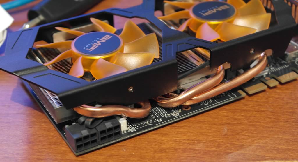Here we see the heat-pipes that help cool the GPU and the rest of the chips. The card uses 2 6-pin PCI-express power connectors.