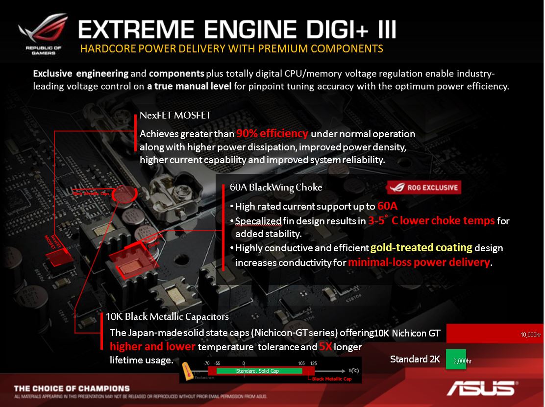 Also worth noting is the fact that the Nichicon GT caps are rated for a wider thermal threshold which means that the operating temps it can handle is much better and it is even better at the extreme cold temperatures some extreme enthusiasts subject these boards to.