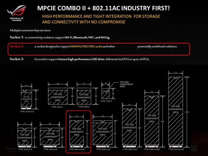 On the mSATA side of things the slot has been replaced with a NGFF (Next Generation Form Factor) slot which is a M.2 socket as you can see from the illustration above which is the best fit for upcoming super high speed mSATA SSD storage devices.