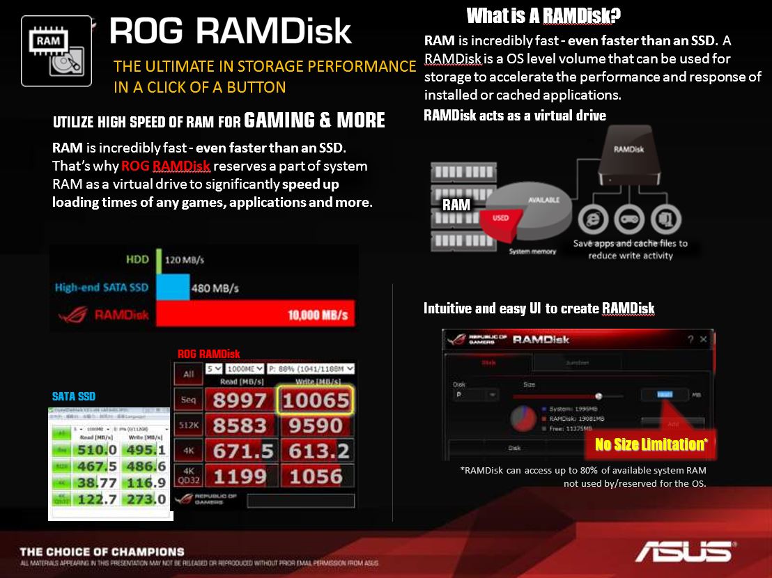 The ROG RAMDisk software is designed with a easy to use UI and as you can see there is no size limitation so you can make a RAMDisk as big as your free memory that is available. This is also awesome as DIMMs continue to increase density the size of RAMDisk can grow as well.