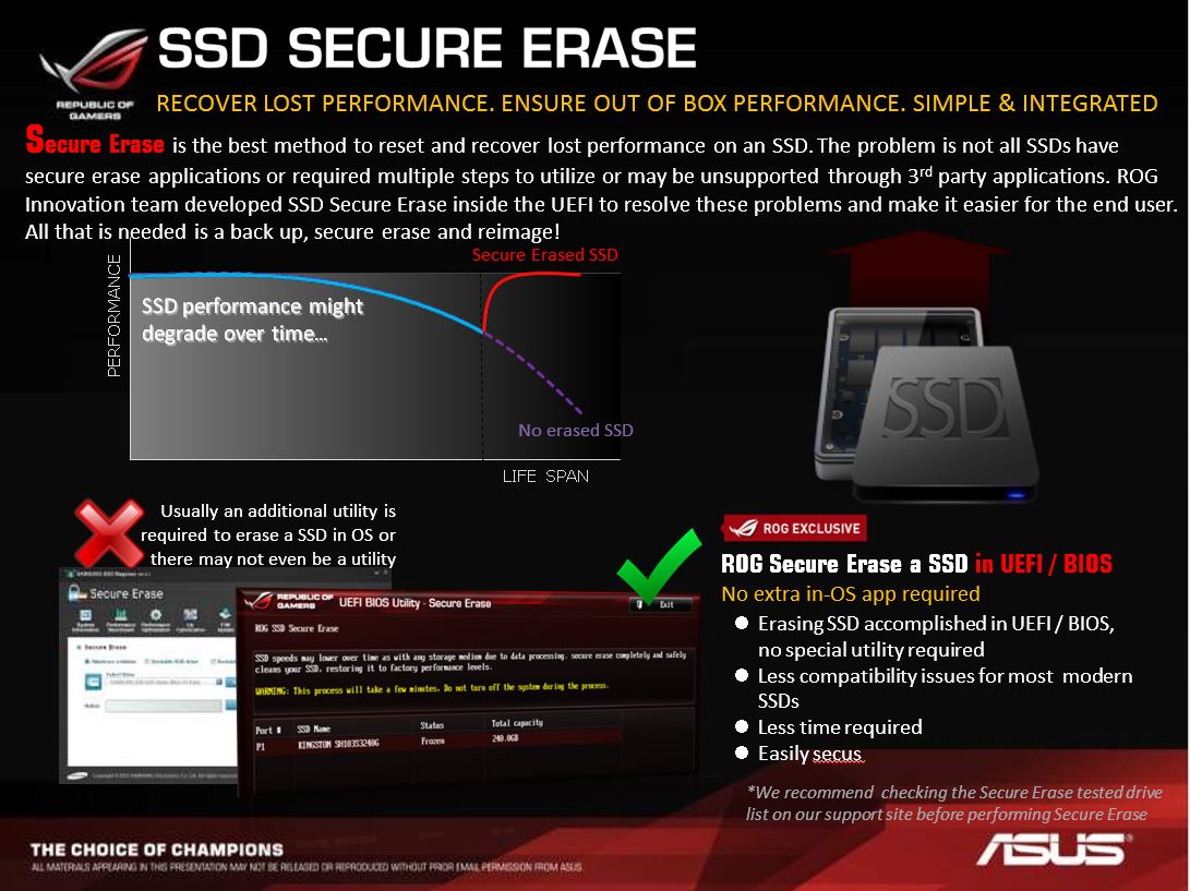 Here you can see the standard falloff of performance simulated on the chart and how the secure erase places it in a like new state. with that considered we know it is a necessary task for optimal performance but with the ROG solution its as simple as going into the BIOS with no extra tools required or software to buy. You get this free with your purchase of the ASUS ROG board.