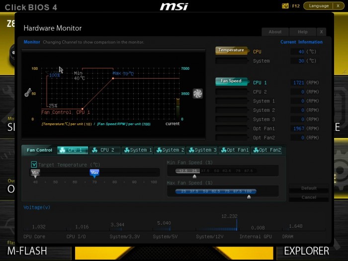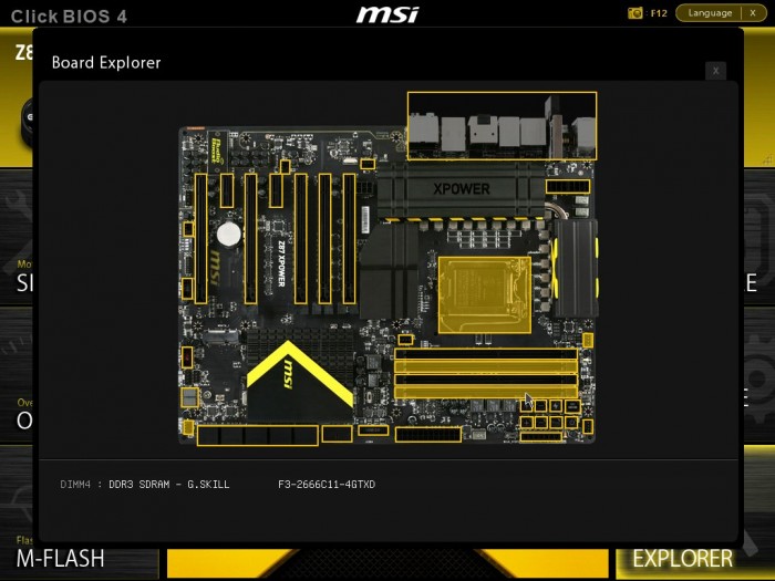 Here you can see the new BIOS looks very nice, and the yellow theme actually plays quite well. The settings are all easy to locate within main and sub menus. the Fan control allows for full fan ramping control based from temperature references or even manual fan controls. Also the board explorer feature is really nice as it allows you to see not just what is populated on the board but even device ID’s for what is installed as you see the DIMM information including exact model number here.