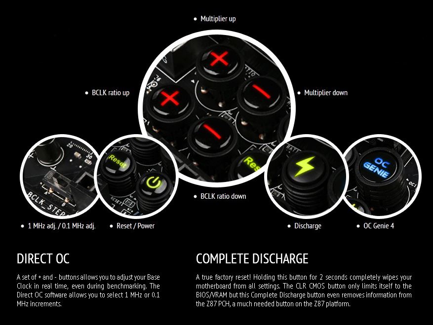 The Discharge button is a pretty awesome feature. It’s like the ultimate BIOS clear, as it clears not just the BIOS settings but even the training and everything from the memory of the board to an even deeper level. Those who bench will know that when a board starts going wonky sometimes you have to remove battery for a minute or two, which clears the board. This switch manages the same effect in just a few seconds so that is one really cool option as this board is mainly designed for those super-high end enthusiasts who will likely use this board at the edge of its stability.