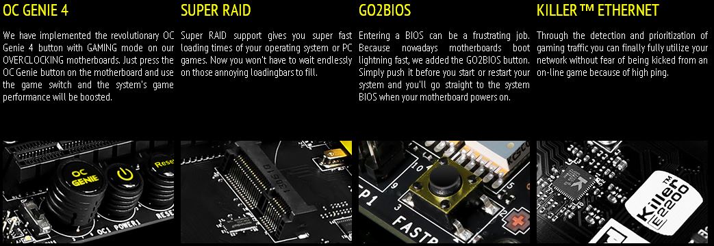 - OC Genie: has been around for awhile and is basically a quick easy to set overclock that is a one touch solution. Its an easy way for a gamer to get a free performance boost from their system. Now with the new “OC MODE” Switch you can change from the standard Turbo OC Genie to the Gaming mode which is a bit more aggressive for even a little bit better performance increase.