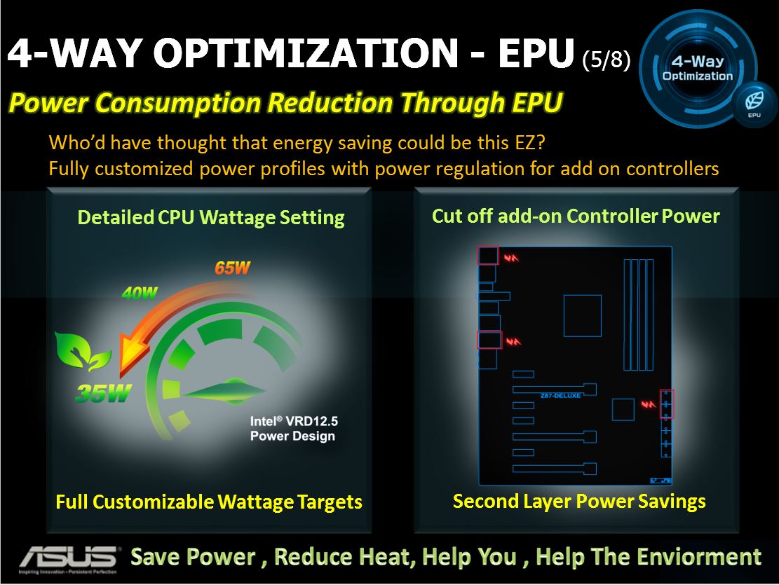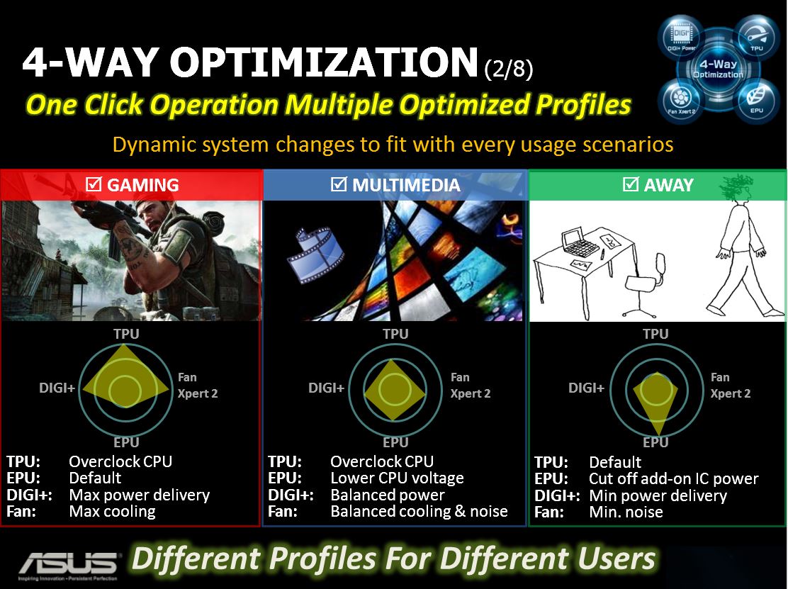 With a single click the 4 way optimization will kick in and optimize the entire cooling/power/overclock and VRM tuning for the ultimate solution without alot of overclocking or tuning knowledge. This is a plus for most users as I myself can tune a system very well but many users simply want a solution they can plug in and game or do whatever they may do from surfing YouTube to Facebook and candy crush. But if your getting a board why would you not tune it up to be the best it can be including optimizations to power savings since thats free money saving from your electric bill monthly which in this tight economy I cannot see as being a bad feature.