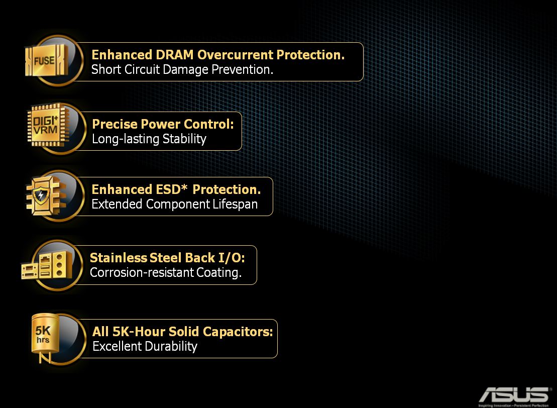 - ASUS ESD Guards – ASUS has included special ESD circuits in the ASUS boards which help ensure that when stray static shocks reach the board they can be absorbed with a lesser chance of damaging critical components.
