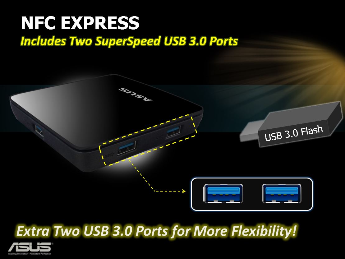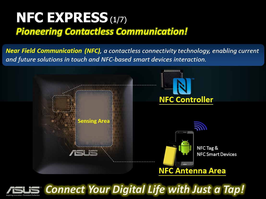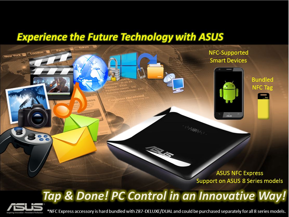 Well ASUS saw some potential in NFC and they made a NFC pod usable to allow easy PC login, file transfer or even RDC with a mobile device by simply tapping a NFC enabled device to the NFC pod which will be connected to the ASUS Motherboard.
