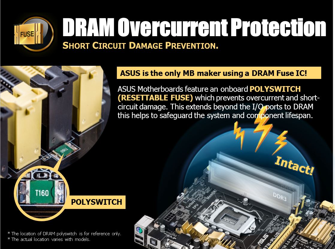- Dram Overcurrent Protection – This is an inclusion of a fuse inline for the DRAM to allow overcurrent spikes to not reach the DIMMS and cause costly system damage which could otherwise take your system down for an extended time and even have costly replacement results.
