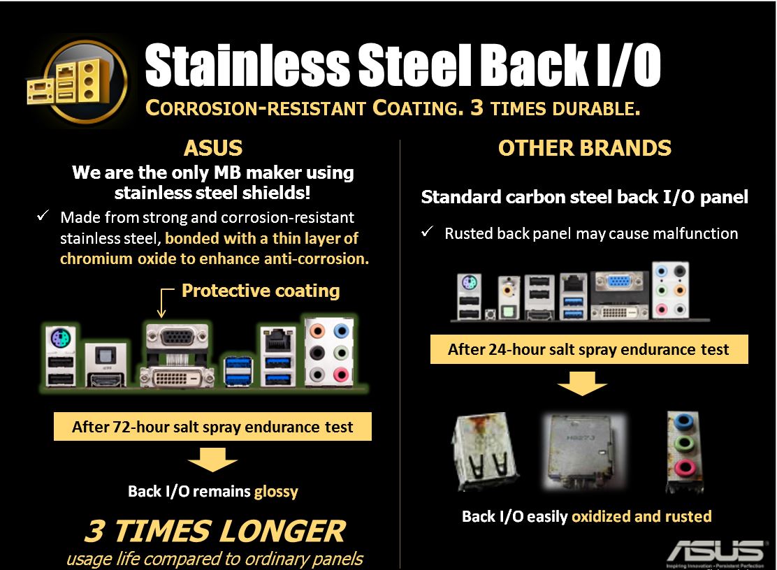 - Stainless Steel Back I/O – The stainless steel back IO is the boxes which hold the rear I/O component ports and employing a corrosion free stainless steel material means that the IO portion will stay corrosion free and in much better working condition for much longer than a standard steel components which when in the harsher climates can definitely be having a bad day very quickly and when rusted or corroded can cause failures of the ports or components.