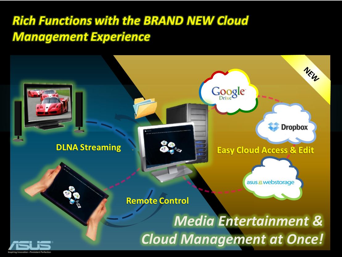 WiFi GO! has been something that ASUS has had for some time and has refined it as time has gone on from just DLNA media streaming among other features to now being a very extensive and capable suite allowing better utilization of your digital home experience. Now with WiFi GO! you can see remote file transfers within your WiFi network, DLNA media hub functionality, cloud based application and data along with Remote desktop control with KB/Mouse controls directly from even smartphone or tablet devices. the cloud storage ability to sync directly with cloud based services such as Google Drive/Docs, Dropbox and even ASUS Webstorage means that integration of your network into the could has never been easier. Even the ability to use the gyro sensor with your phone or tablet as intuitive controls in some gaming environments via the remote desktop control function adds yet another layer to the capability of the WiFi GO! functionality.