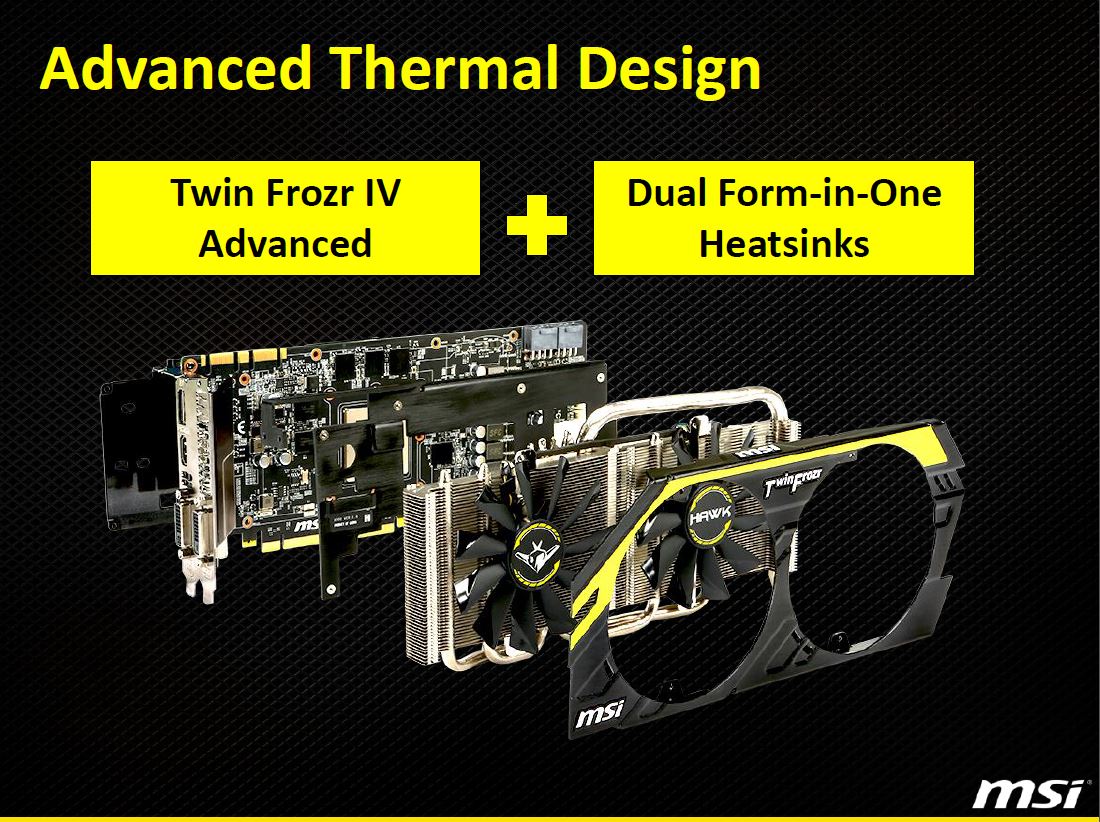 Here you can see a break down of all of the Twin Frozr Advanced components that make up the full cooling solution on the GTX 760 HAWK card.