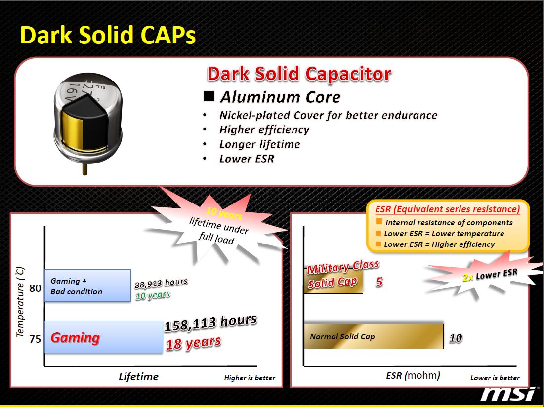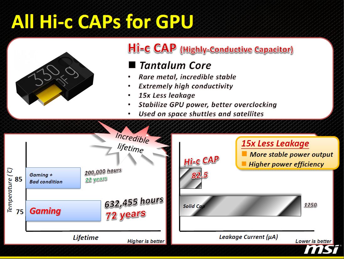 MSI has long touted the Military Class components on their cards due to the fact that they are specially tested components, not just by them but by a third party testing center according to the enclosed certificate. “Military Class components” sounds nice, but are they really necessary on a card or motherboard? Honestly, no as most times the reference components are good enough to do their job. However, they are not designed to push the limits to the extreme. The answer is better and stronger components. Most manufacturers worth their salt will use better components, so in order to try and stand out, MSI uses “Military Class” components in an attempt to ensure better hardware reliability.