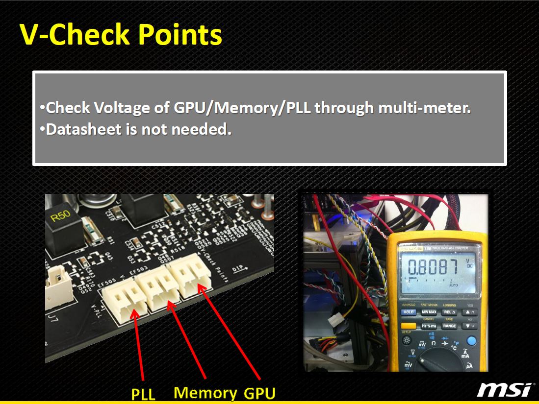 Also V-Check points allows for attachment of probes to allow real time monitoring of set voltages directly at the card hardware level. This ensures you can see any fluctuation or even voltage not being applied properly in loaded scenarios to help diagnose issues while benchmarking.