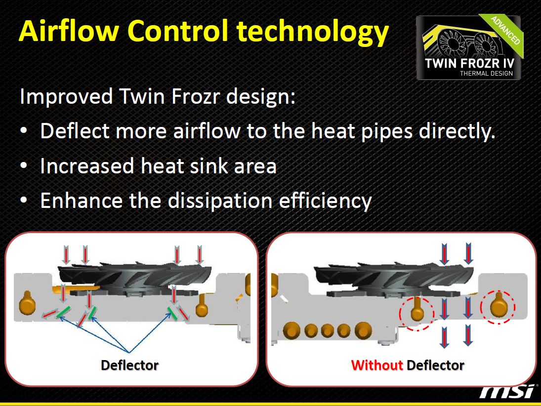 The Airflow control internal fins built into the cooling fins allows channeling the cooling airflow over the heatpipes along with around the fins for an even better cooling performance result which in the end helps the card stay cooler and boost stronger.