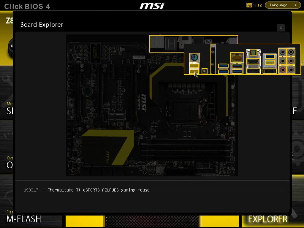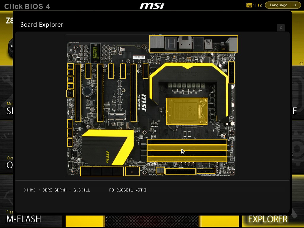 Here you can see the new BIOS looks very nice, and the yellow theme actually plays quite well. The settings are all easy to locate within main and sub menus. the Fan control allows for full fan ramping control based from temperature references or even manual fan controls. Also the board explorer feature is really nice as it allows you to see not just what is populated on the board but even device ID’s for what is installed as you see the DIMM information including exact model number here.