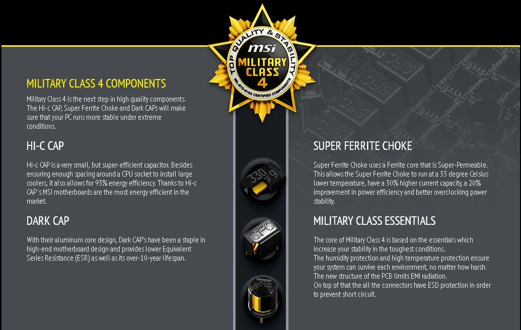 When MSI puts military class components to the fire they are not joking as they come to the table claiming to have passed multiple tests following Mil spec (MIL-STD-810G) Tests including: