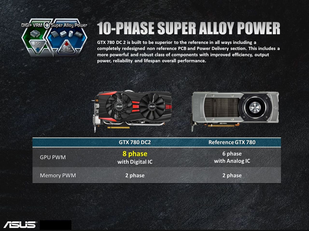 Here we see the comparison of the reference model which has a 6 Phase VRM vs the DirectCU II OC model which employs the 8 Phase solution for enhanced power capability.