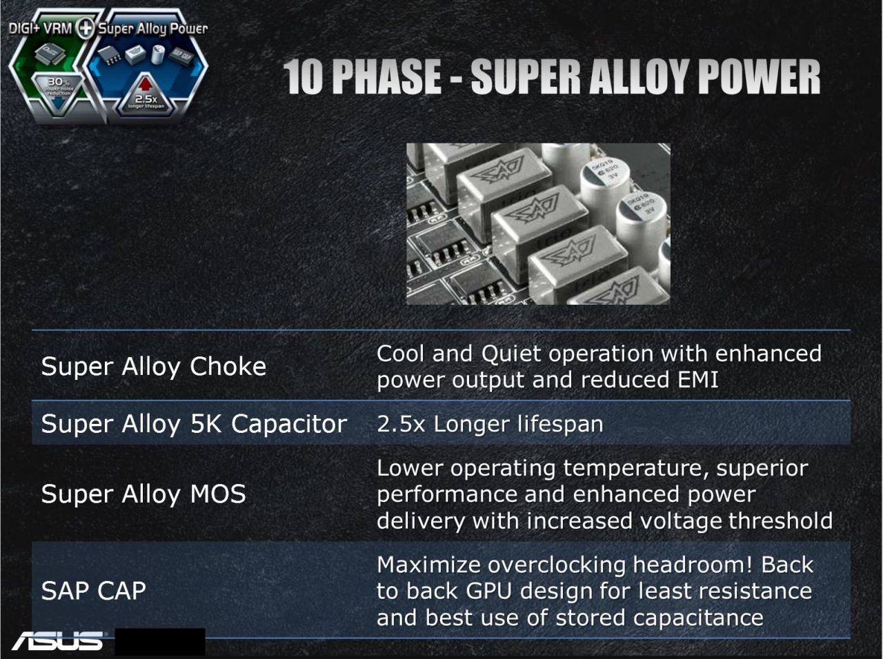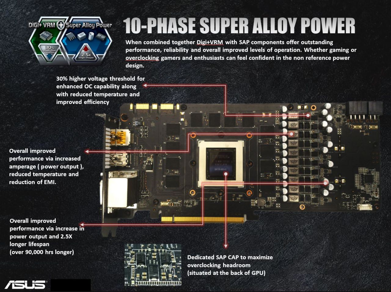 ASUS has great pride in the components they infuse into their graphics offerings, very much like the motherboards we have covered previously. ASUS has what’s called a SAP or Super Alloy Power, which covers the components in the very VRM we are discussing. The components are hand picked for quality and performance based around not only power delivery but efficiency as well. The components in the SAP solution are super durable for a rated lifespan of up to 2.5x what reference cards would offer.