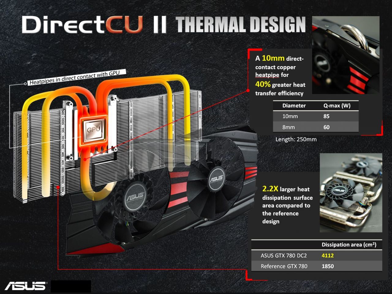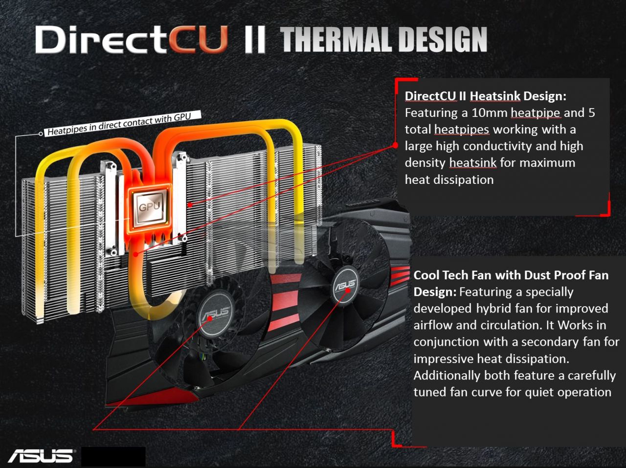 ASUS DirectCU II coolers are the ASUS way of saying maximum cooling and plenty of quiet with one naming scheme. DirectCU II coolers are direct touch heatpipes to the GPU surface, ensuring the heat is wicked away from the GPU and up into the cooling fin array as quickly as possible. From there, the custom shrouded dual fans push air through the fins effectively but most important quietly to keep the GPU as cool as possible so hopefully it will never hit a temp to need a higher or noisier fan speed. The air pushing through the fin array also helps cool board components and the VRM as well, which is a nice little added bonus to this style cooler since we all know cooler components tend to run stronger, longer and with better efficiency.