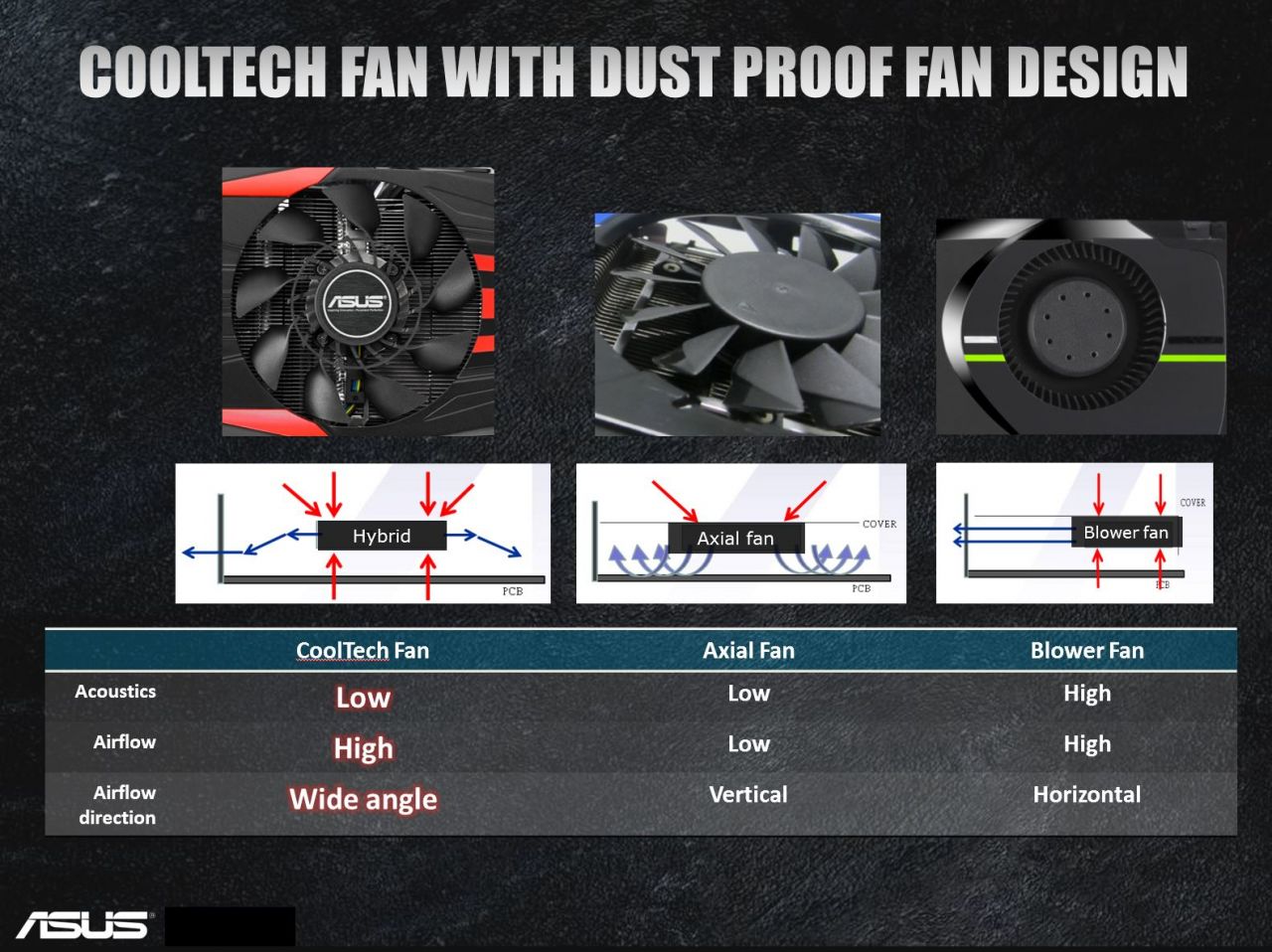 I know some will ask why not use two of these fans so I asked ASUS and their answer was what I assumed already which is that dual blower fans will actually fight against each other as the lateral air will crash into each other and cause unnecessary noise and turbulence so therefor a single unit handles that cross-flow with a standard fan in the second position. As you can see from the ASUS supplied image with the “Rice Test” they test a standard curve bladed fan design vs the Cooltech and you can see the airflow power at same RPM and the results are excellent for the Cooltech model.