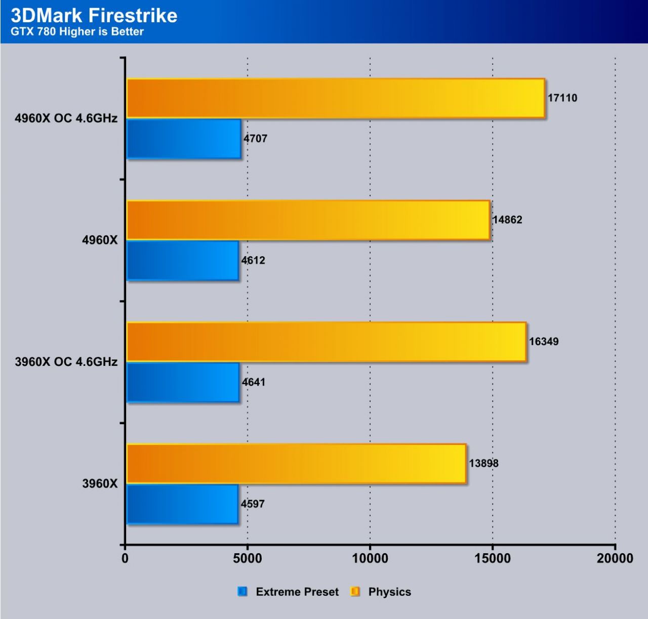 With 3DMark (2013) Firestrike which is made for high end desktop configurations you have two modes which is standard performance and extreme each of which stresses the system differently but both are made to show performance on higher end systems which means its perfect to show what this platform can do. Straight away the single 780 gets put to work and you can see that the increases scale quite well similar to the 3D11 test with the Ivy based solution and even when locked at the same speed for the OC tests the Ivy based solution simply pulls better results.