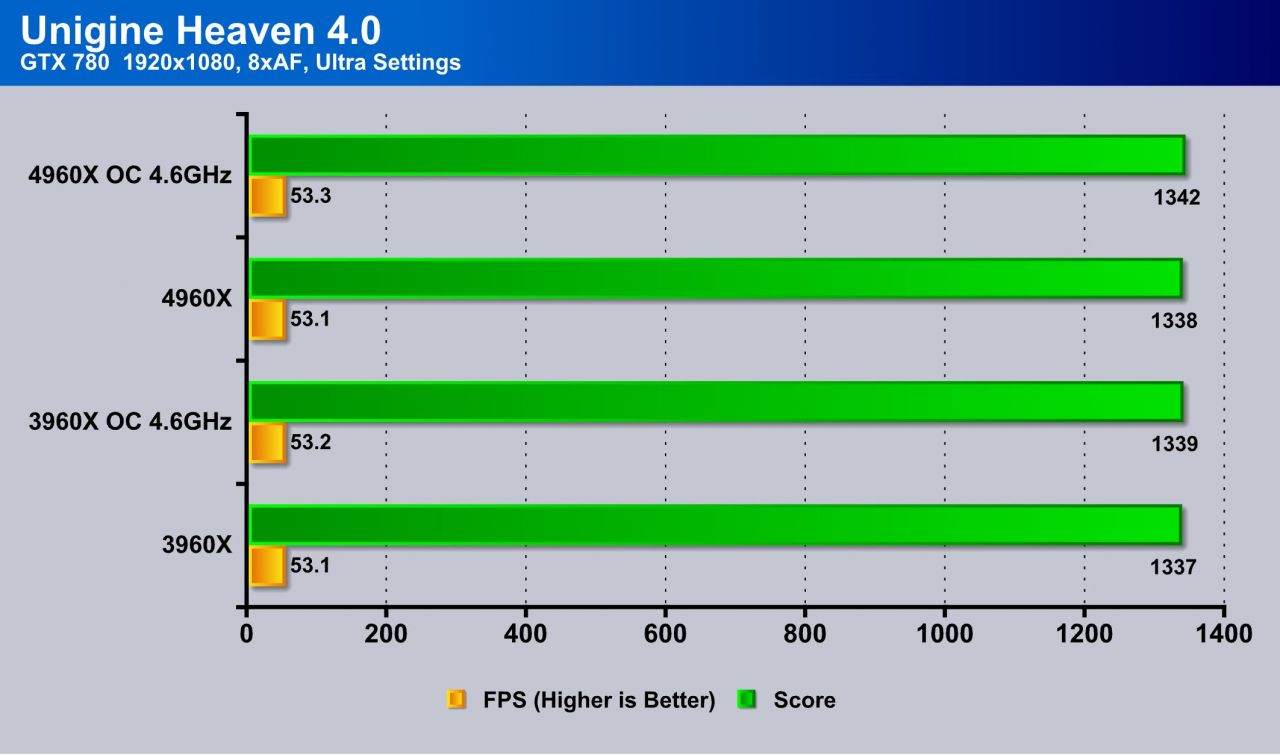 Unigine Heaven using the 780 at max settings shows a very menial or marginal gain and within margin for error which tells me that the PCIe bus is not saturated on either platform and performance under this kind of load is spot on similar.