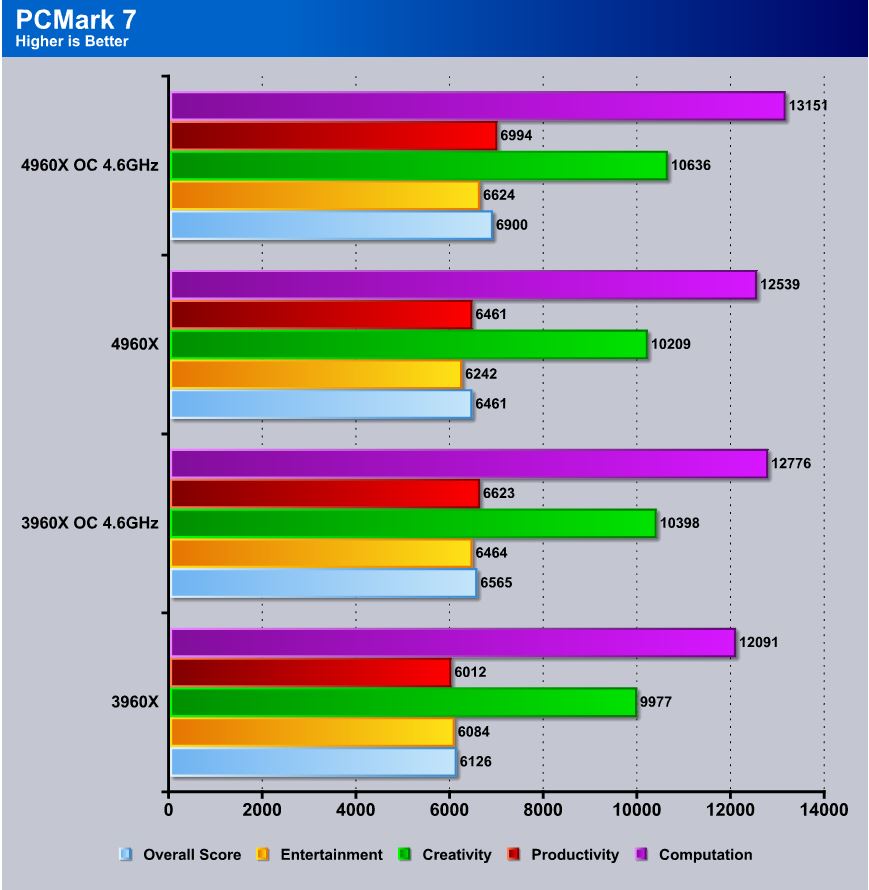 First up is PCMark and, we can see that overall there is a very nice increase with not only computation but areas such as entertainment, as you can see overall the efficiency pays off in spades here as the rig can simply do more work but you must remember that the stock speeds the 4960X is 100MHz faster so I tend to look at the OC speeds where we locked each chip in at 4.6GHz and as you can see even there it does very well with a nice solid lead.
