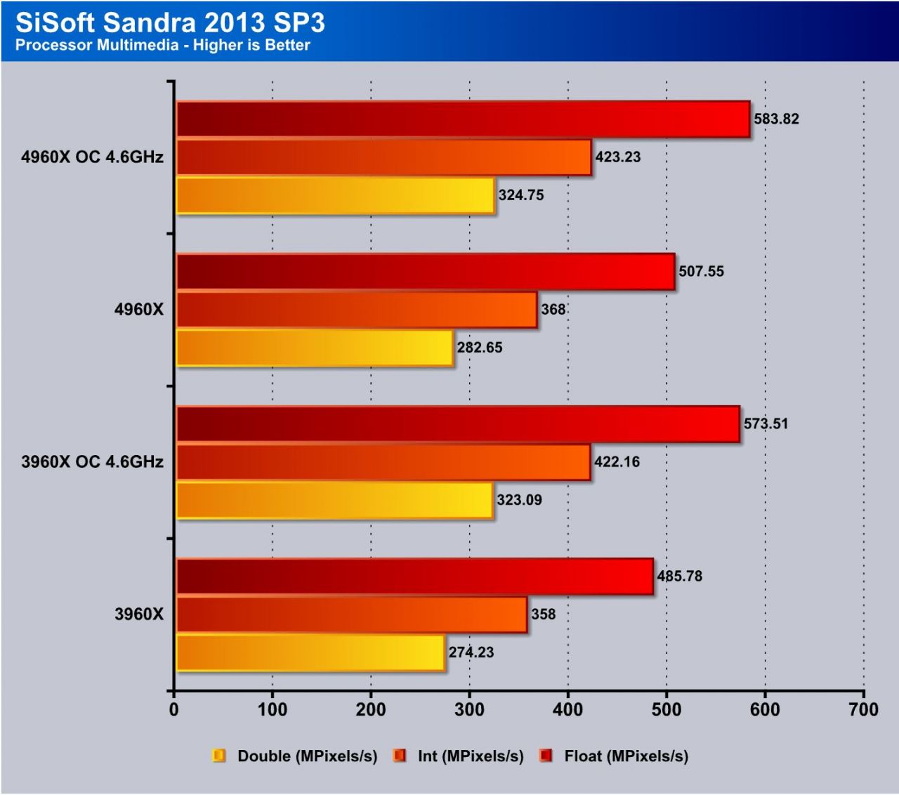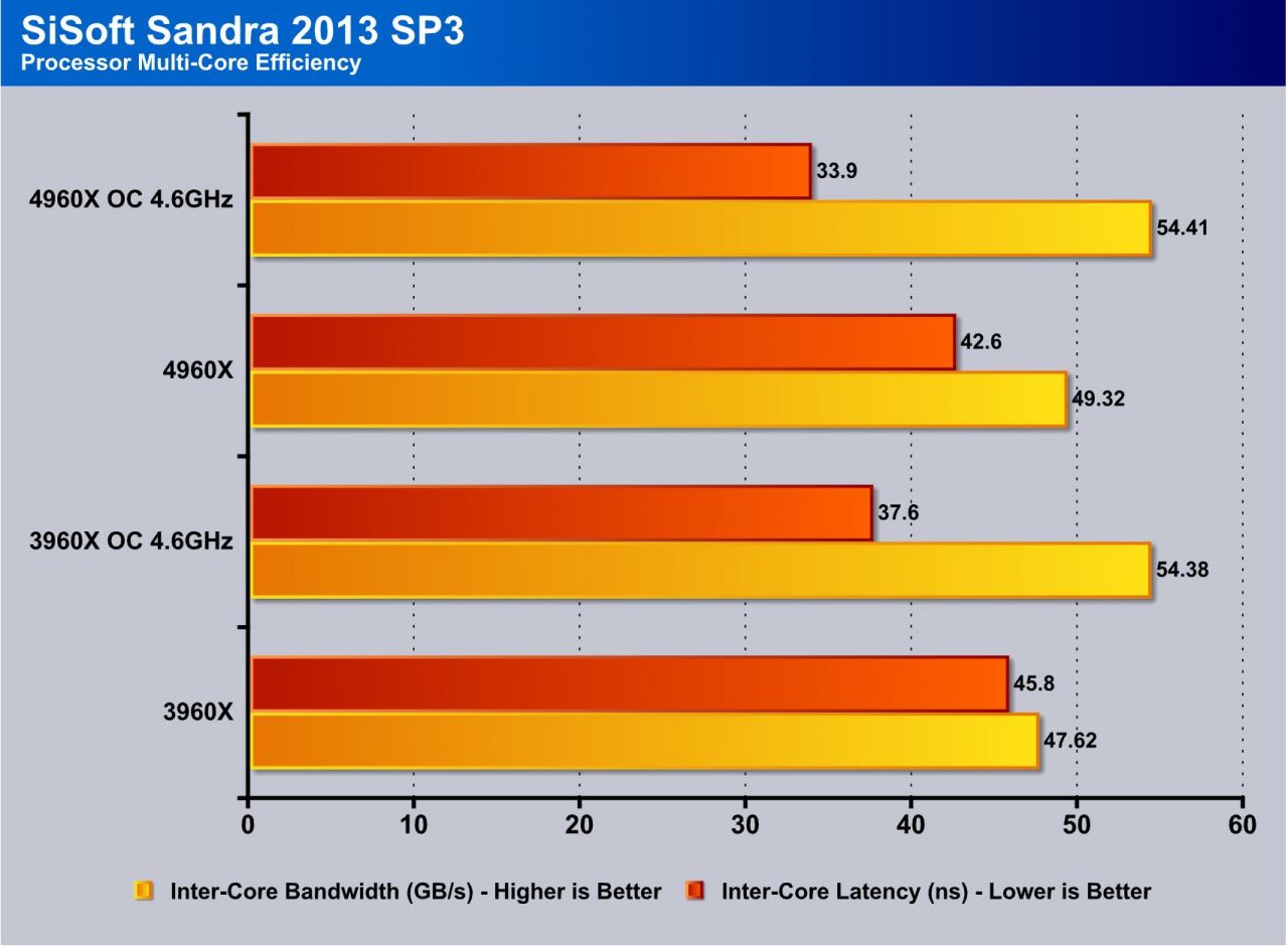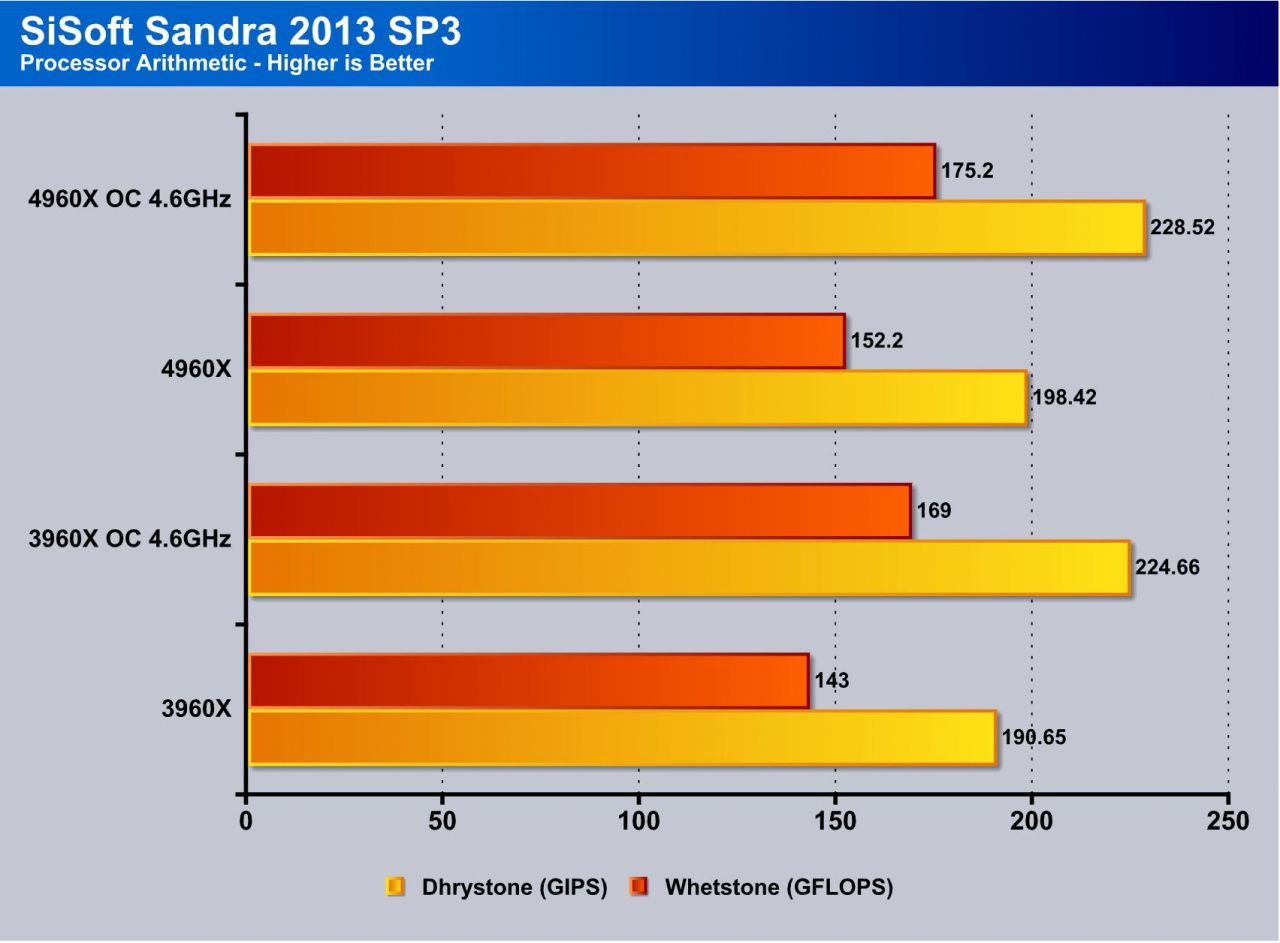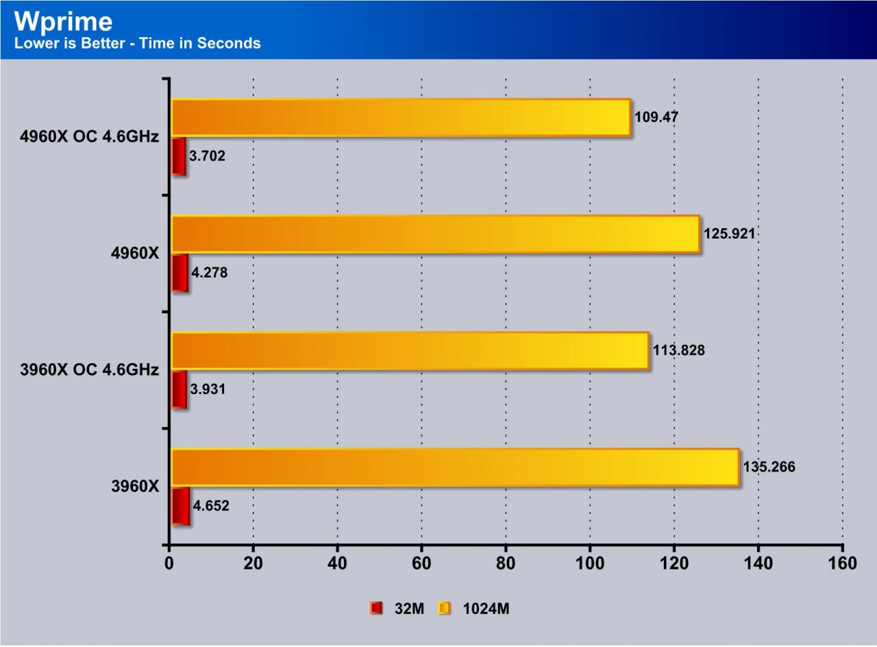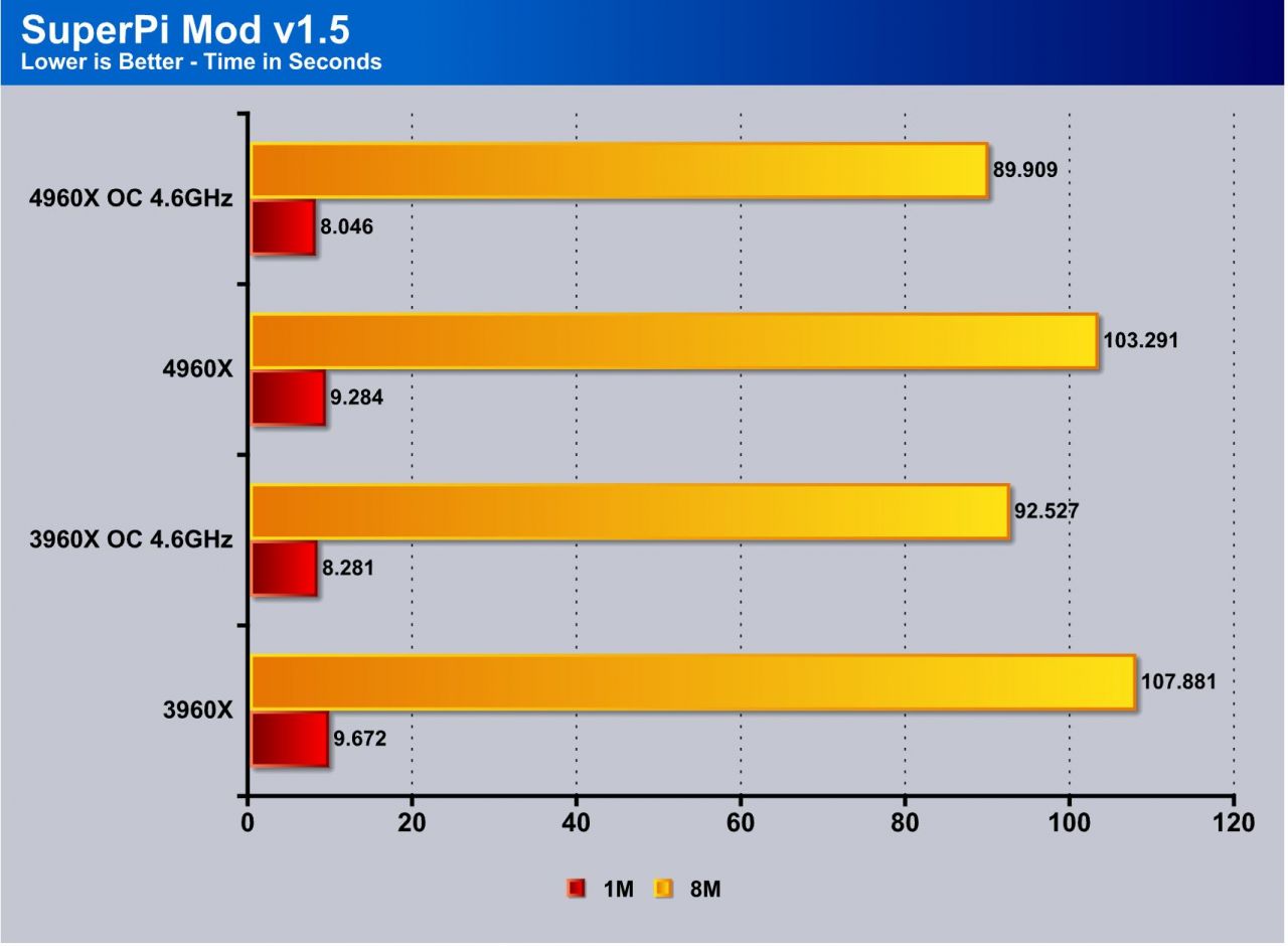 This tests single threaded performance and clock efficiency by processing digits of the number pi. Moving from the 3960X to the 4960X you can see an approximate gain of 3% at the same clock speed under the OC results which shows the work can be done a bit faster but its not a huge increase as I would expect closer to around 7-8% honestly.